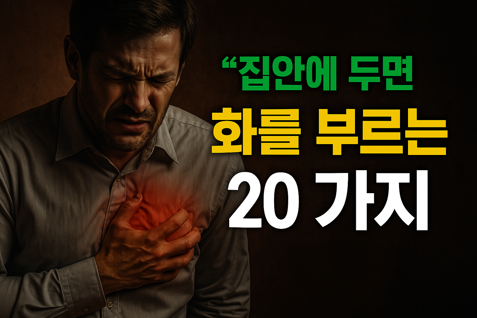 가정 불화·운세 하락…집 안에 화를 부르는 위험한 물건 20가지. 집 안의 환경은 우리의 운세와 기운에 큰 영향을 미친다고 합니다. 특히 풍수지리에서는 특정 물건들이 집안의 에너지를 저해하고, 재물운과 건강운을 막는다고 경고합니다. 아래는 집안에 두면 '화'를 부를 수 있는 20가지 물건과 그 이유를 정리한 목록입니다. 깨진 거울거울은 기운을 반사하고 증폭시키는 역할을 합니다. 깨진 거울은 왜곡된 에너지를 방출하여 집안의 평온함을 해칠 수 있습니다. 고장 난 시계멈춰버린 시계는 시간의 흐름을 막아 집안의 발전과 성장을 저해한다고 여겨집니다. 시든 화초생기가 없는 식물은 죽은 기운을 상징하며, 집안의 활력을 떨어뜨릴 수 있습니다. 사용하지 않는 전자제품오래된 전자제품은 정체된 에너지를 만들어내어..